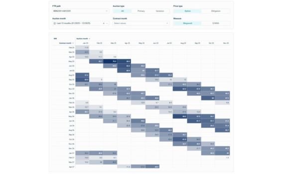 A visualisation of financial transmission rights prices and cleared megawatts by month.