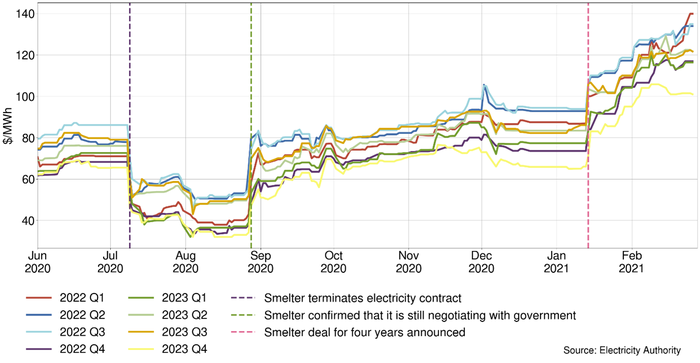 Big news events have significantly moved futures prices. A good example of this was in July 2020 when the Tiwai Point aluminium smelter terminated its electricity contract and it seemed likely to close. This caused the futures prices to drop significantly. When the smelter confirmed it was still negotiating with the government in August 2020, the futures prices rose back up. Finally, in January 2021 when a four-year Tiwai deal was announced to keep it open, futures prices rose again. These changes in futures prices are shown in Figure 1.