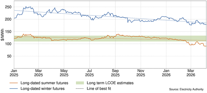 This is likely due to the influx of new renewable generation coming into the generation investment pipeline, lowering expectations of future prices as they contribute cheap energy to the system. More information about incoming generation can be found in the Electricity Authority’s generation investment dashboard.