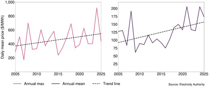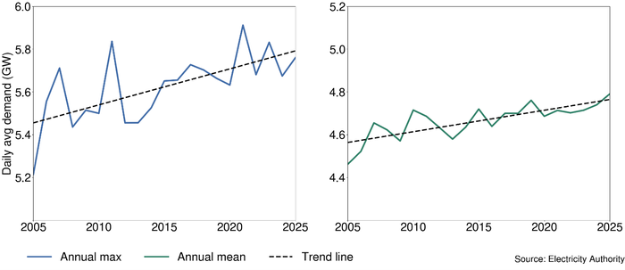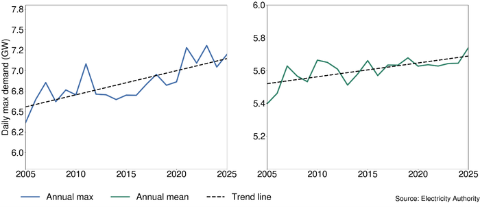 Both daily maximum and daily mean demand in New Zealand have been trending up. This demand increase is due to population increases, new technology being adopted, and electrification in the residential, transport, commercial and industrial sectors. These factors outweigh energy efficiency gains and installed 'behind-the-meter' generation (mostly rooftop solar).