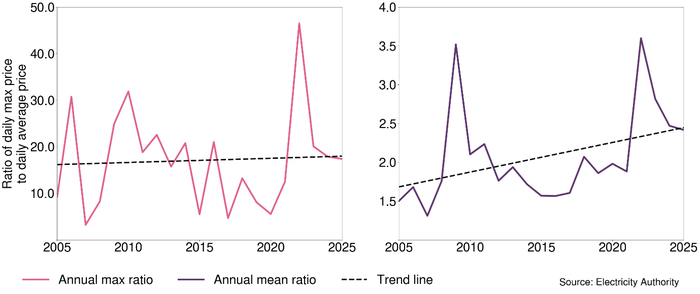 Figure 7 shows the trend in the ratio of the daily maximum price in a half-hour period compared to the daily average price of the same day.