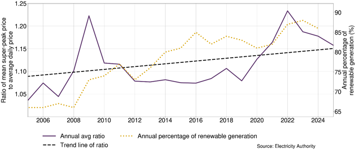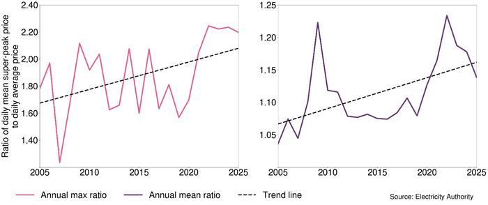 The prices during the daily demand peaks have been increasing relative to daily average prices. Overall, wholesale electricity spot prices have become higher during super-peak times relative to average prices over the last 20 years.