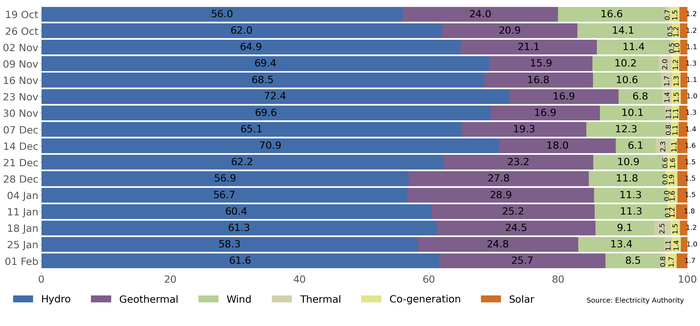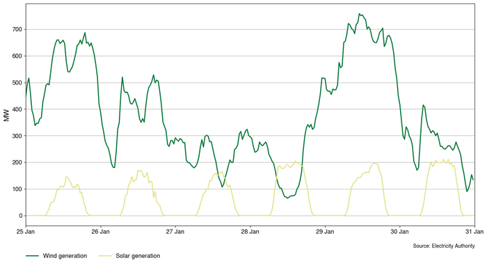 Since 2023, 247MW of grid connected solar has been installed in New Zealand. From mid-October 2025 grid-connected solar has contributed between 1 and 2% of total supply (Figure 1). Solar has often been contributing more than thermal generation1, which has been below 1% most weeks since last October. Overall, generation has been greater than 97% renewable since that time.