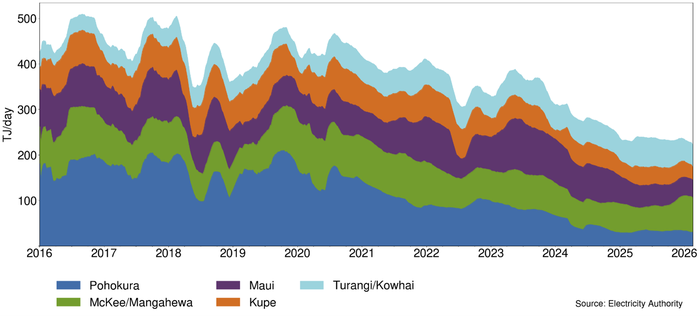 After those outages, gas production from the field declined quickly. In 2025, Pohokura was producing the least gas among New Zealand’s major gas fields. Figure 2 shows daily gas production at major fields from 2018 to now.
