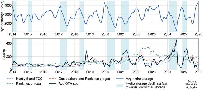 When hydro storage is declining quickly towards winter, this tends to push spot prices above gas and coal generation costs. This is because generators start pricing some energy from their hydro generation higher than thermal costs to encourage thermal generation to run in place of hydro generation and hence conserve water for the coming winter. These periods are shaded in blue in Figure 3. There is also some evidence that the sensitivity of spot electricity prices to periods of declining hydro storage has increased since 2018.