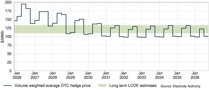Long-term electricity hedge price estimates are similar to the levelised cost of electricity estimates (Figure 1). This is good because it indicates investment in generation is likely to cover its costs.