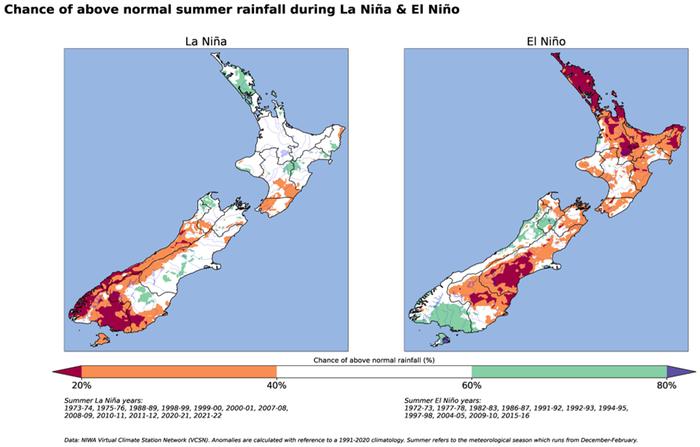 In New Zealand, an El Niño phase typically results in increased westerly winds in summer, bringing less rainfall to eastern areas and more rainfall to the west, as shown in Figure 1. In winter, El Niño leads to more frequent southerlies, leading to cooler temperatures across the country. If El Niño occurs during spring or autumn, south-westerly winds are more frequent.