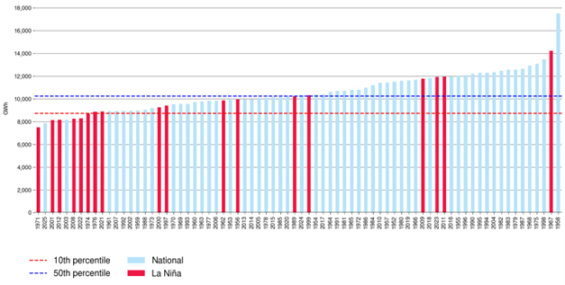 Eight of the 10 lowest average national inflows for January to May occurred during years that experienced a La Niña summer. Outliers, such as 1967, could have been influenced by factors beyond ENSO, such as higher snowmelt.