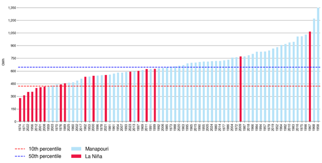 As Figure 1 shows, La Niña can impact summer rainfall in regions where large South Island hydro storage lakes are located. Figure 2 shows average national hydro inflows for January to May, going back to 1952. Years for which a La Niña summer occurred are highlighted in red.