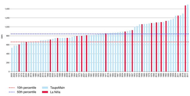 Figure 4 shows the historic January to May inflows for Lake Taupō. As Lake Taupō typically receives normal levels of rainfall during La Niña summers, there is no obvious impact on hydro inflows. Inflow variability between years is likely being driven by other factors aside from by ENSO.