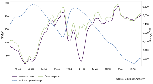 Figure 5 shows that hydro storage declined during January 2022, before continuing to decline even further from mid-February. When these declines in hydro storage occurred, wholesale prices (also Figure 5) increased. These price increases were driven by reductions in hydro generation, with generators choosing to conserve water for future use, resulting in more expensive thermal generation coming online.